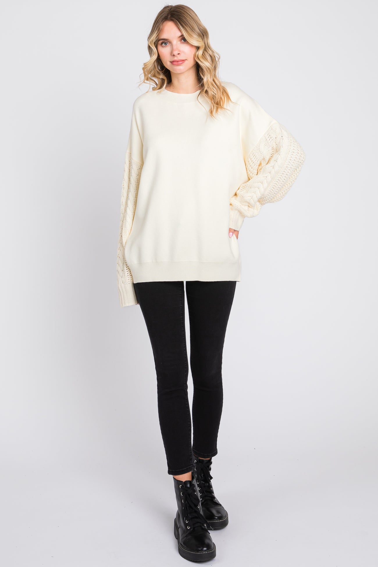 An ultra soft knit sweater featuring a mock neckline, contrast cable knit sleeves and ribbed trim.