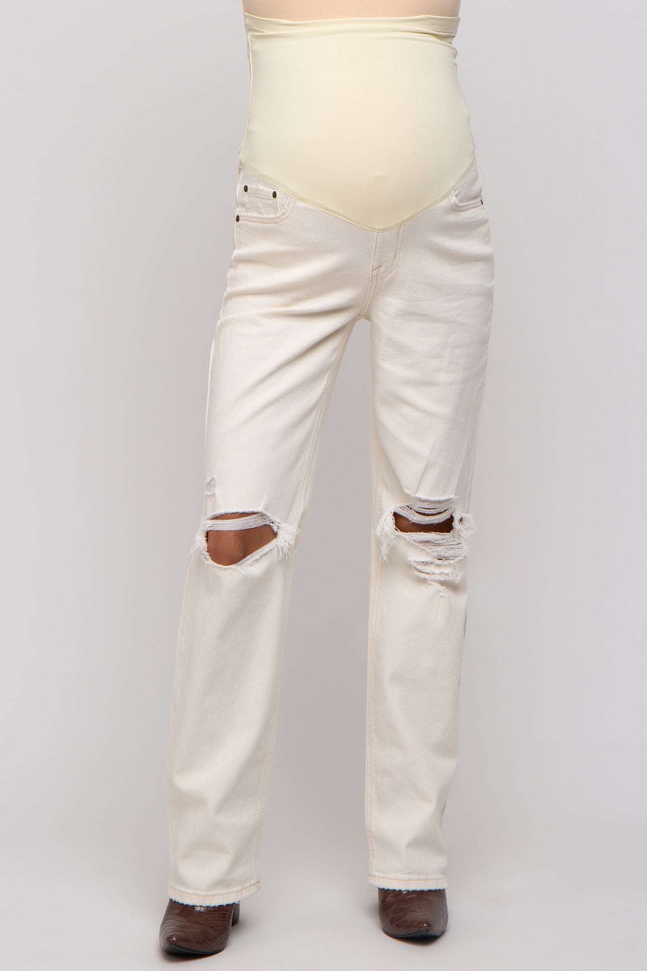 A pair of straight legged maternity jeans featuring distressed knees, 5 pockets, and an elastic belly band.