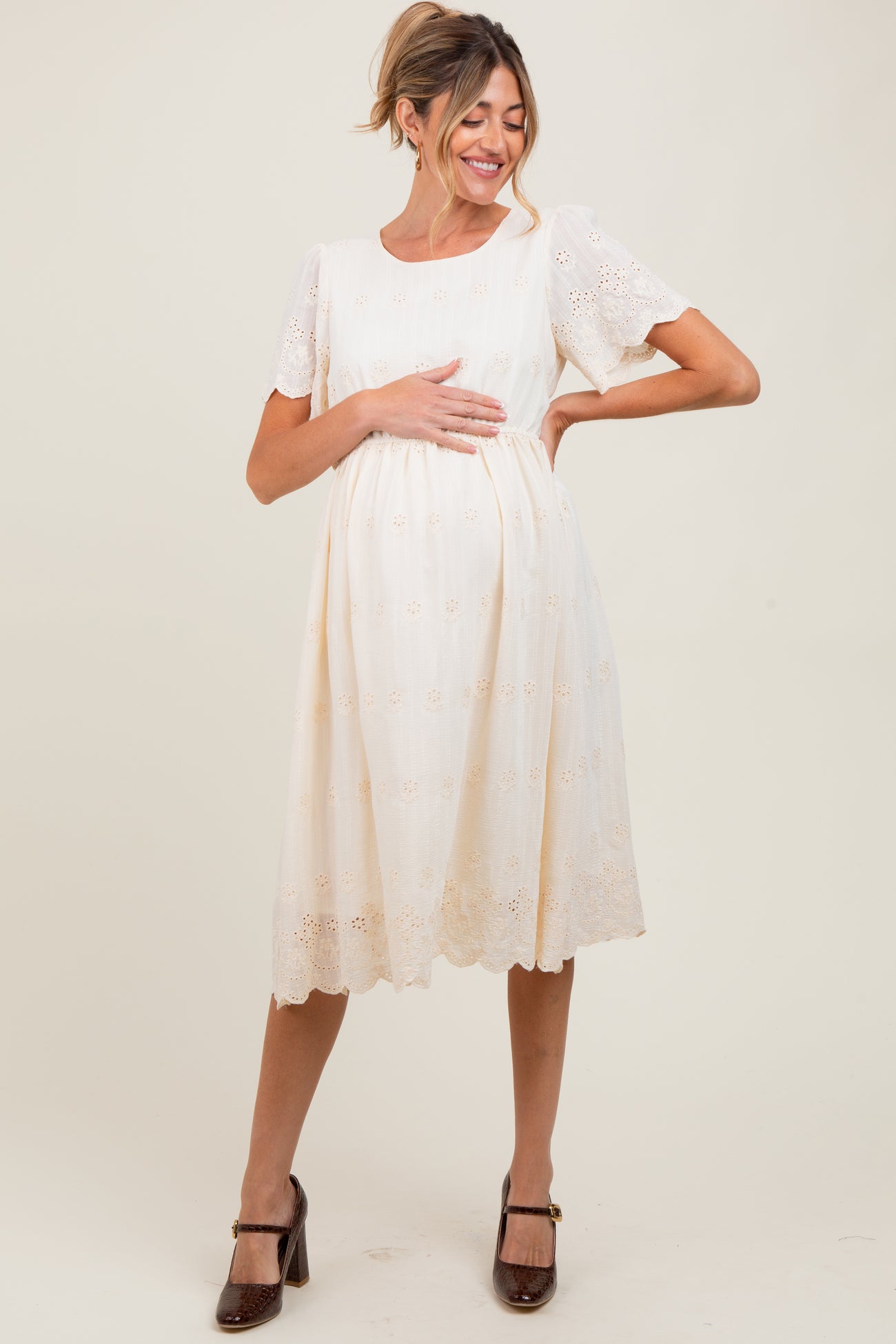 Cream Eyelet Lace Scallop Hem Maternity Midi Dress