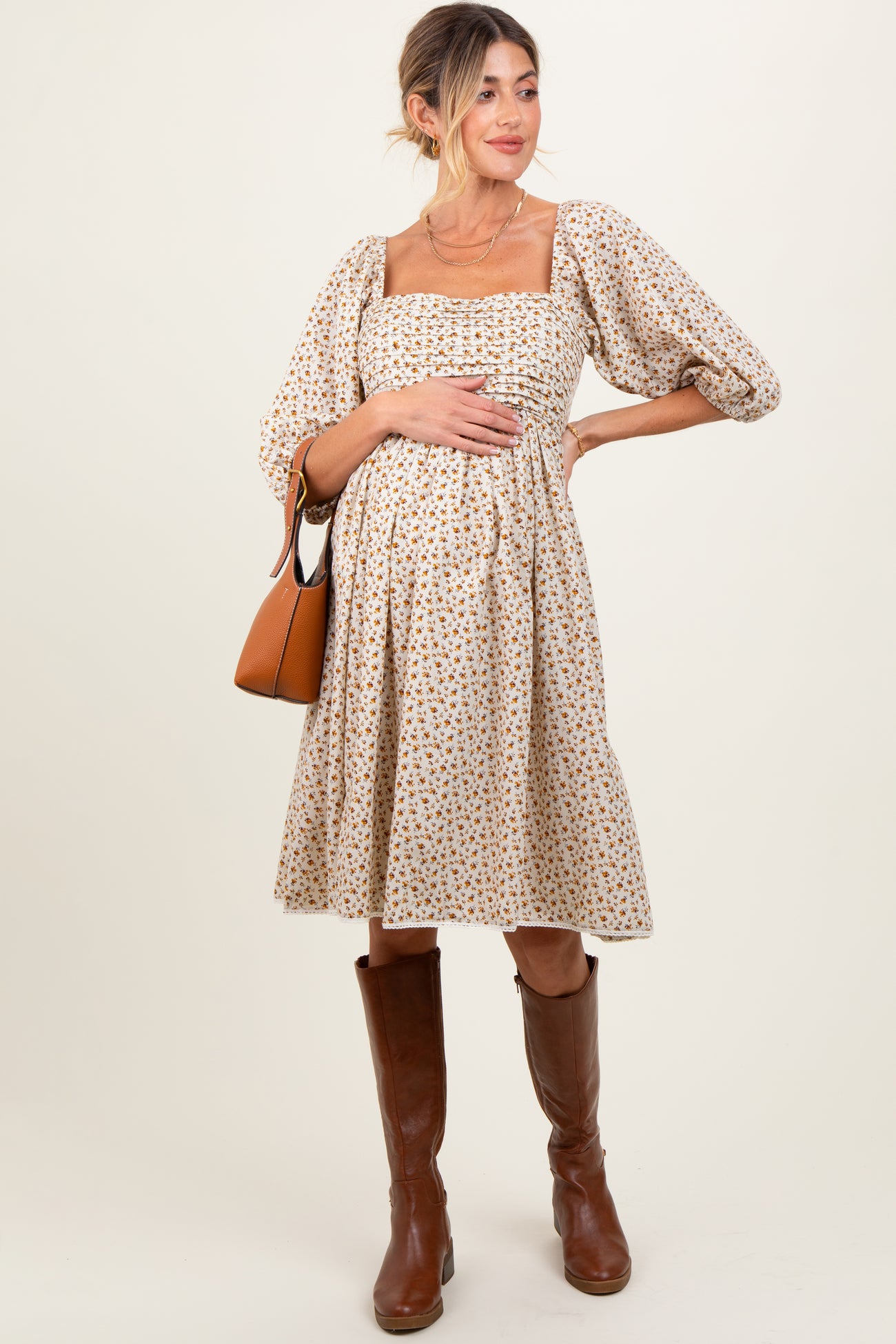 Cream Floral Pleated Bodice Lace Trim Maternity Midi Dress