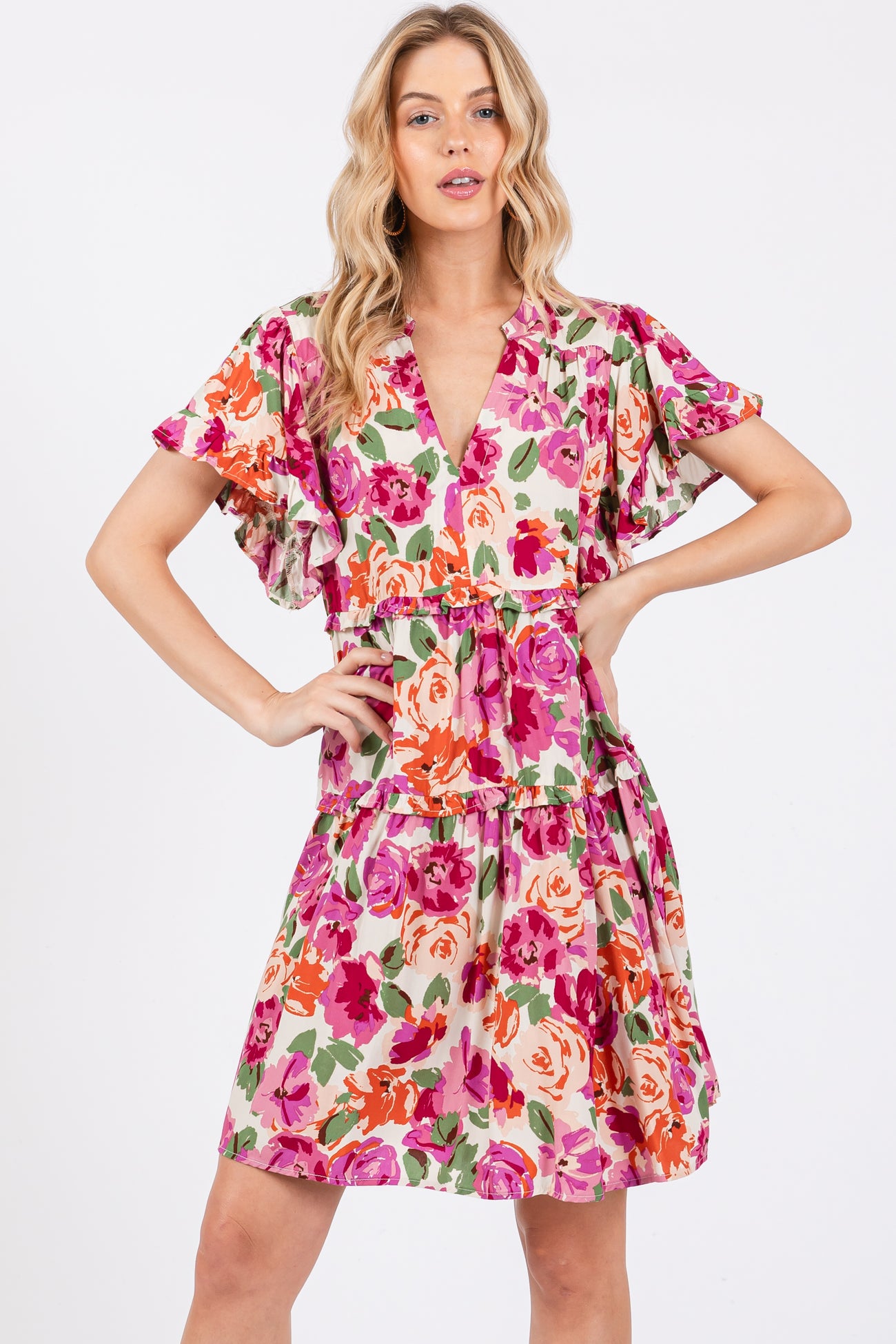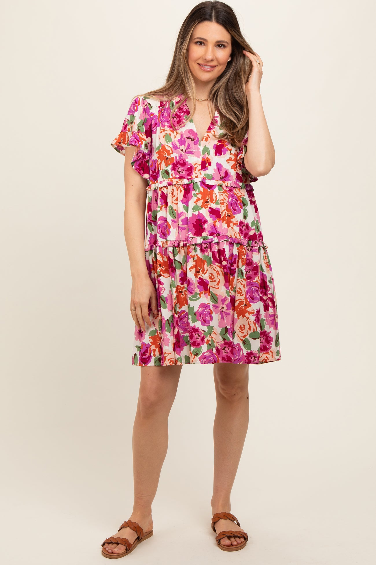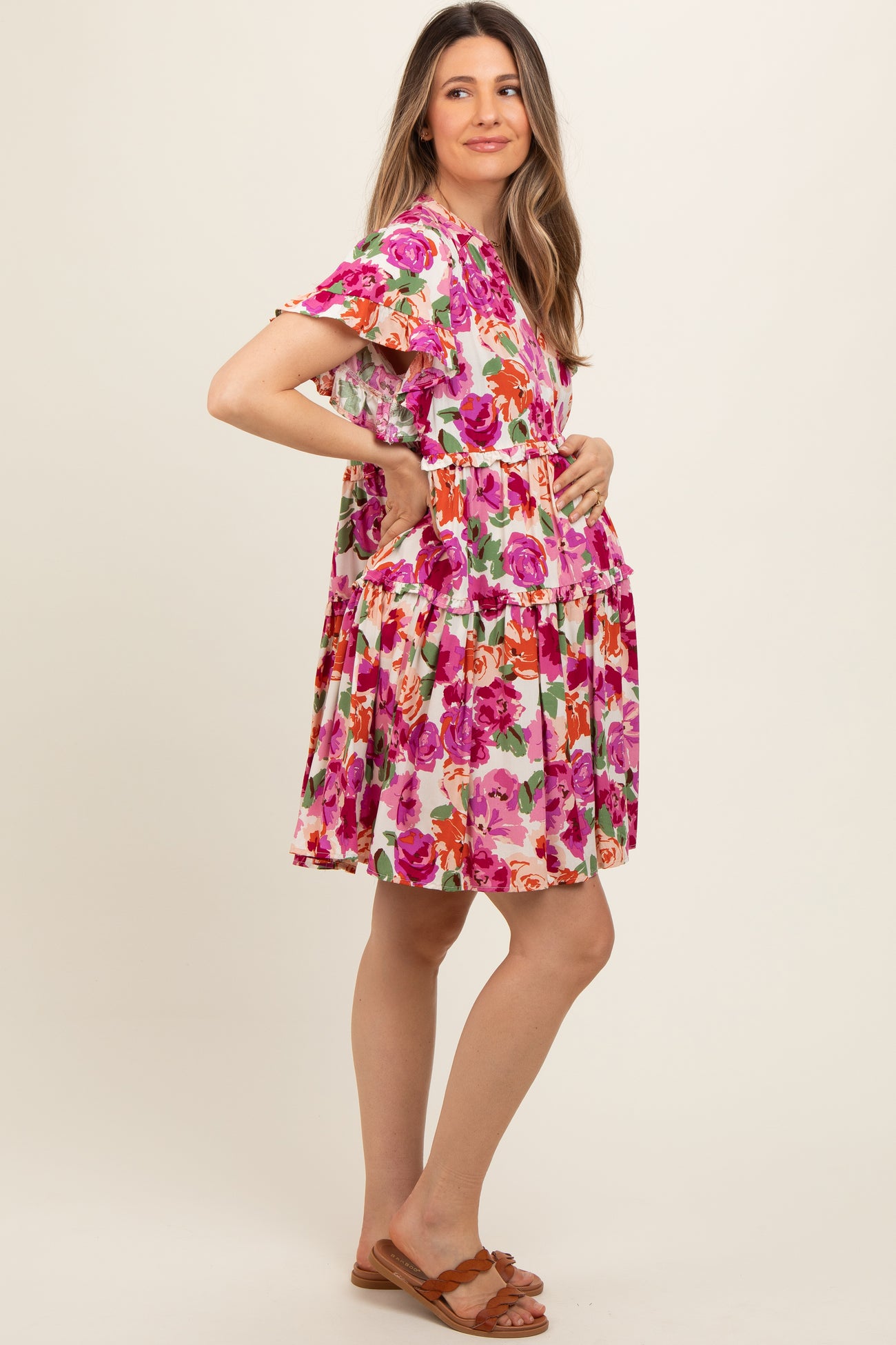 Cream Floral Ruffle Tiered V-Neck Maternity Dress