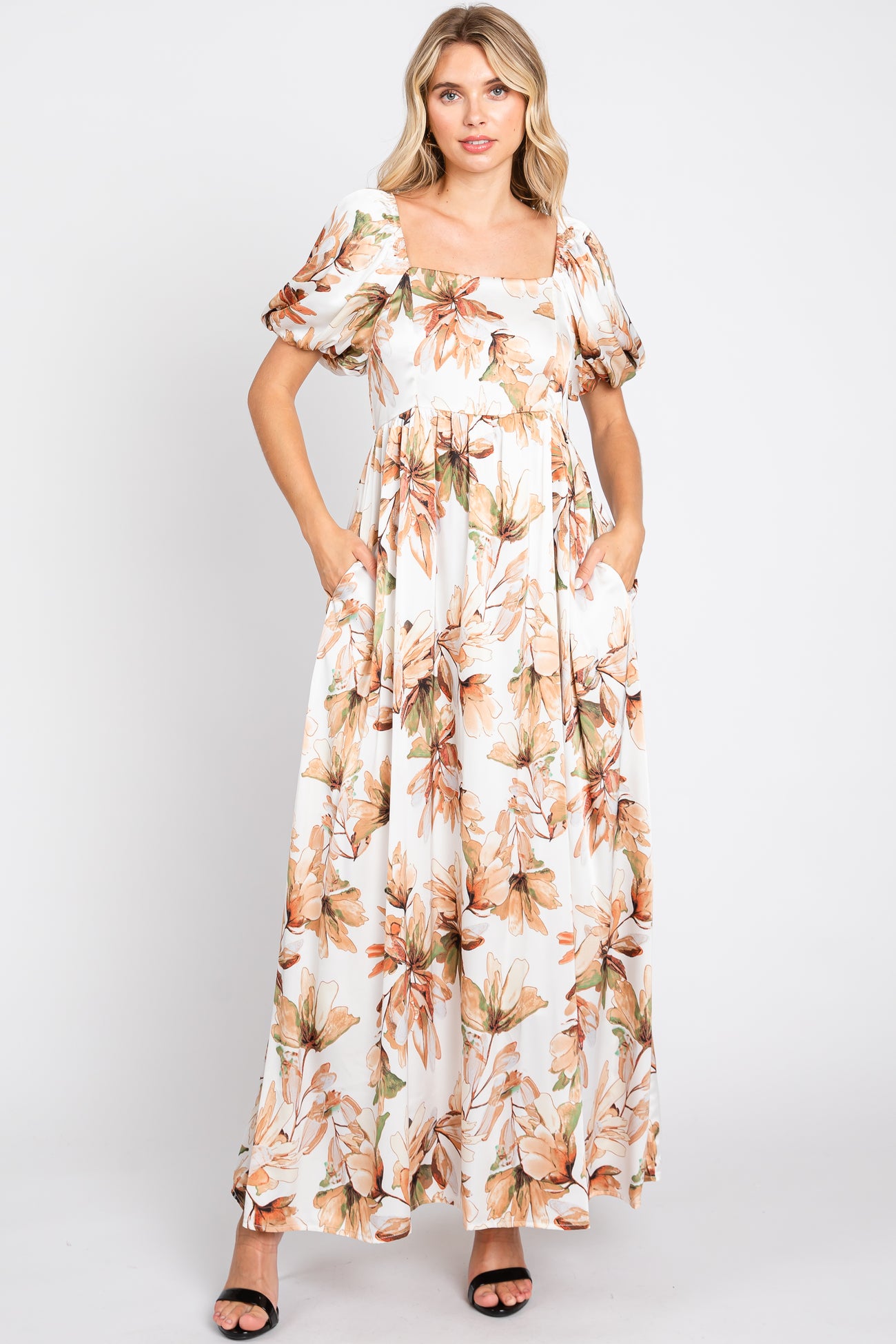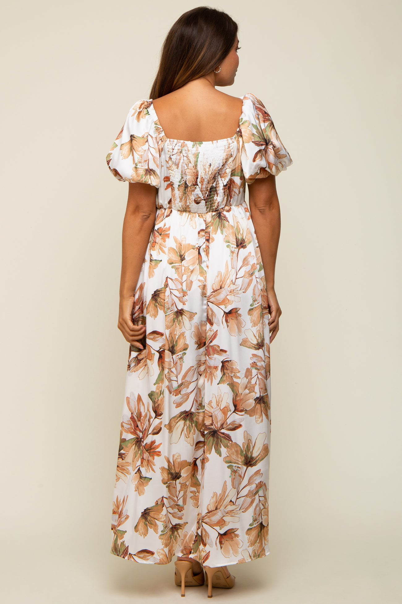 Cream Floral Satin Puff Sleeve Maternity Maxi Dress