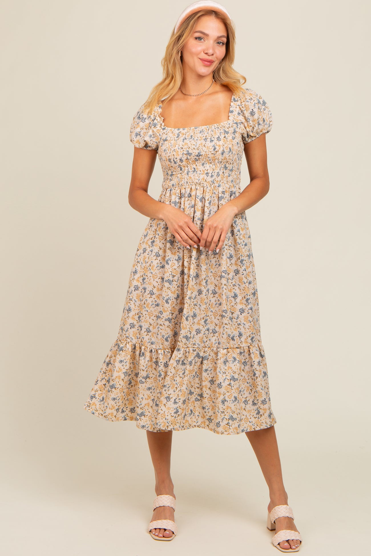 Cream Floral Smocked Ruffle Hem Midi Dress
