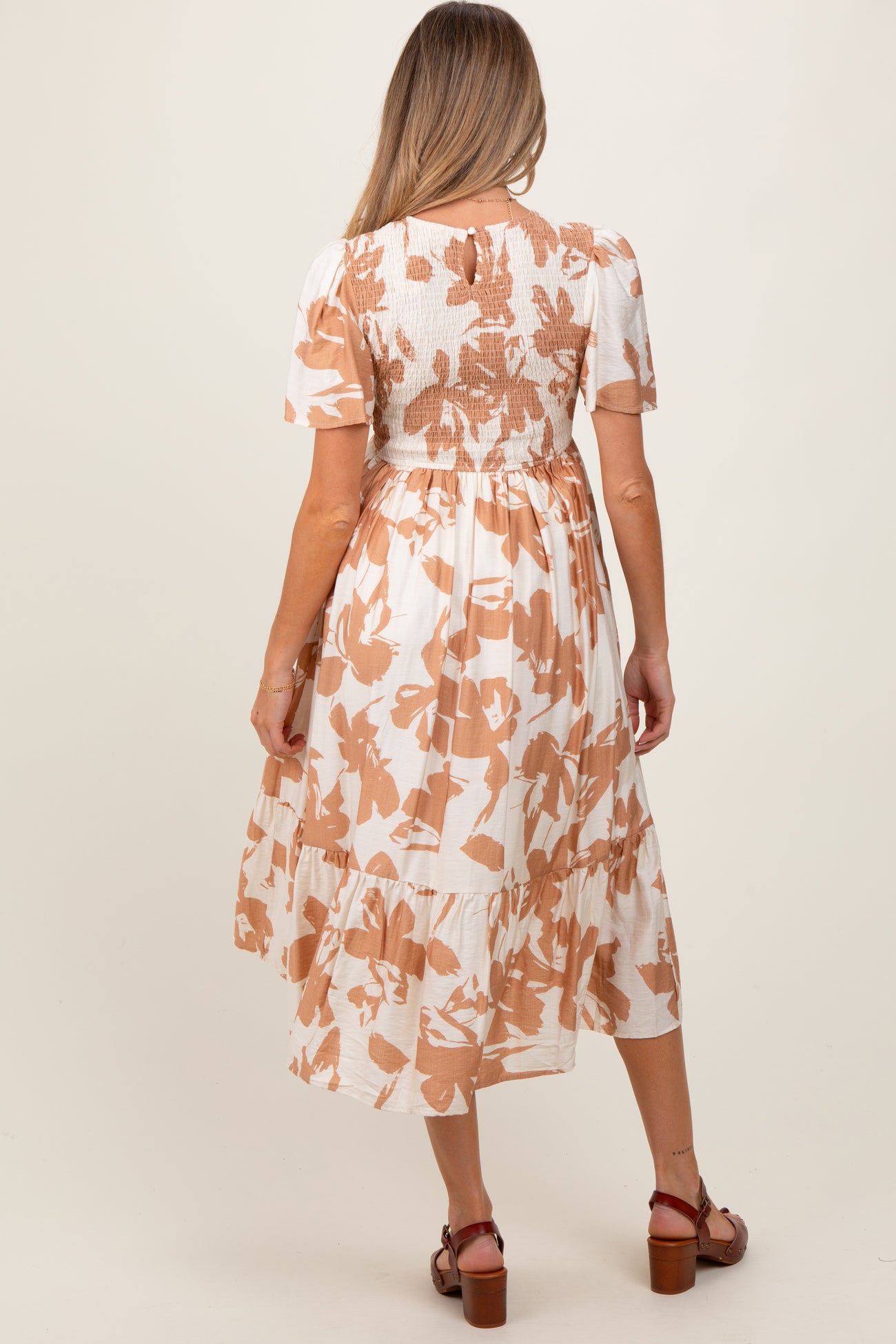Cream Floral Smocked Short Sleeve Maternity Midi Dress