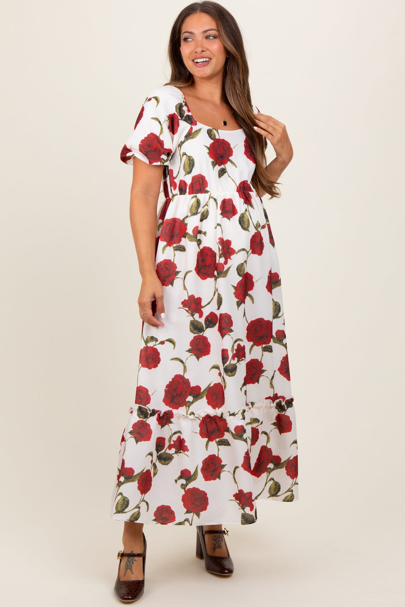 Cream Floral Square Neck Short Puff Sleeve Maternity Midi Dress