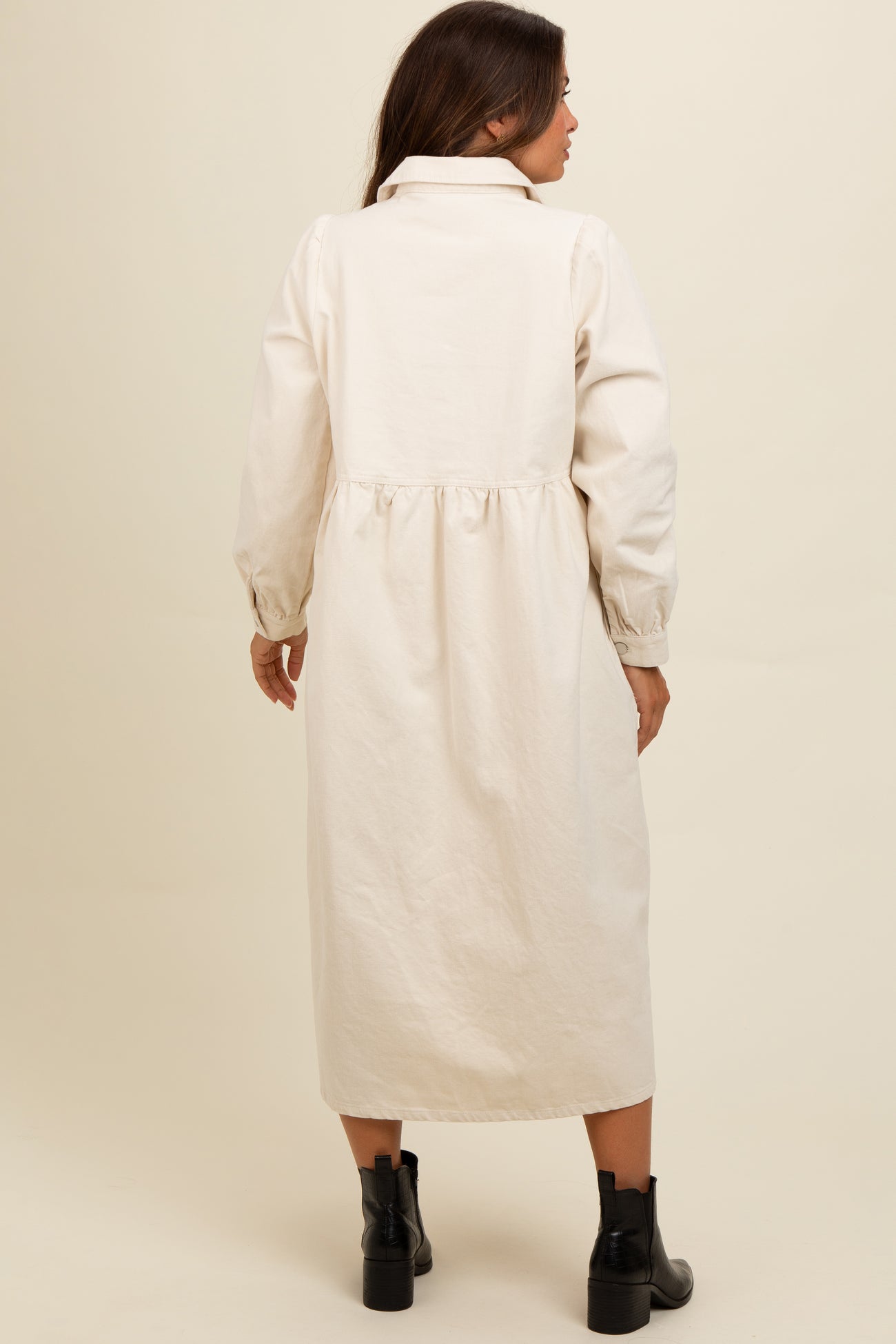 Cream Half Zip Front Pocket Collared Maternity Midi Dress