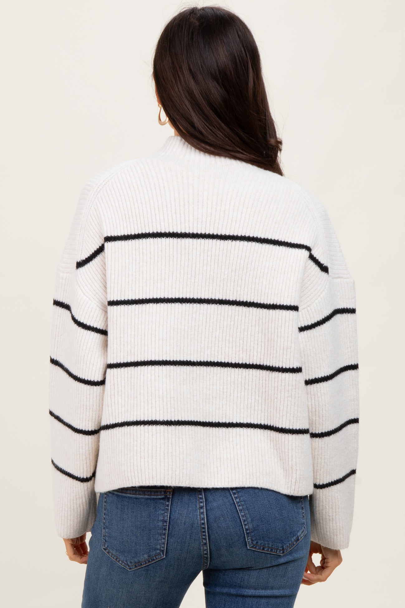 Stay cozy and chic with our Cream High Neck Ribbed Knit Sweater. Featuring a soft, warm fabric with a flattering ribbed texture, this sweater offers comfort without compromising style. The classic high neck provides extra warmth and a timeless silhouette, while bold black horizontal stripes add a modern twist to this versatile piece. Its relaxed fit and long sleeves make it perfect for layering or wearing on its own. Pair it effortlessly with your favorite jeans or skirts for a polished casual look. Ideal for cool days, this sweater is a wardrobe essential for everyday elegance.