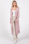 A solid hued long maternity cardigan featuring long sleeves, side pockets and an open front.