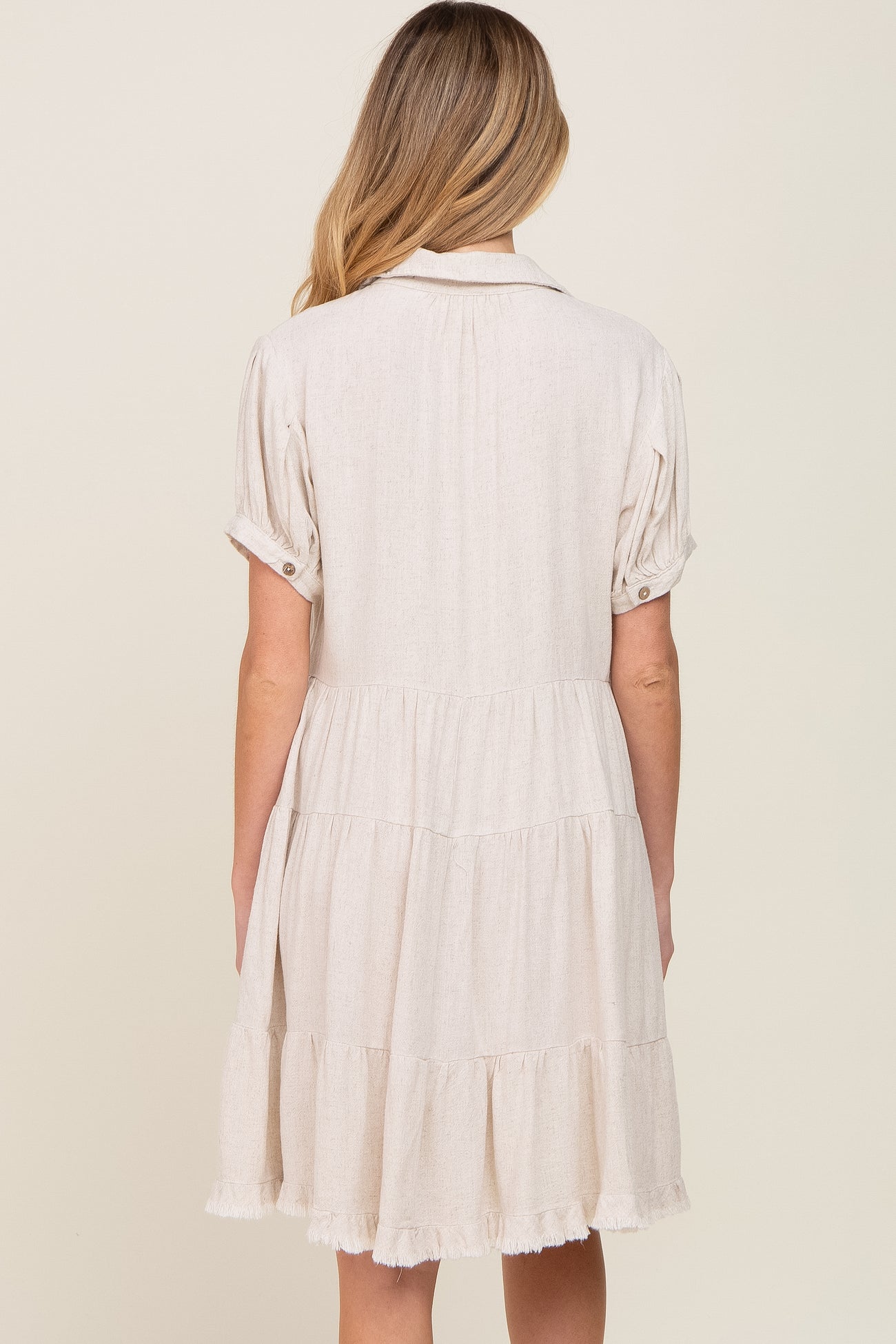 A linen maternity dress with short puff sleeves, a collar, front functioning buttons, a tiered skirt, and a frayed hem.