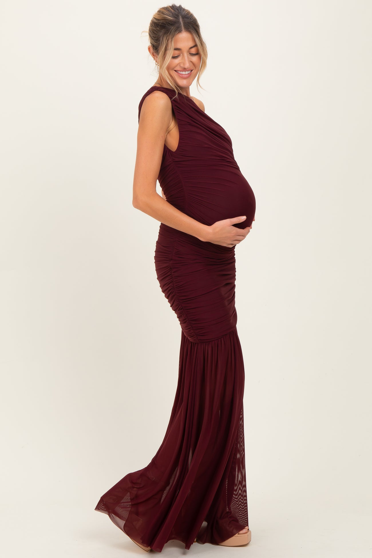 Dark Burgundy Ruched Mesh One Shoulder Maternity Maxi Dress