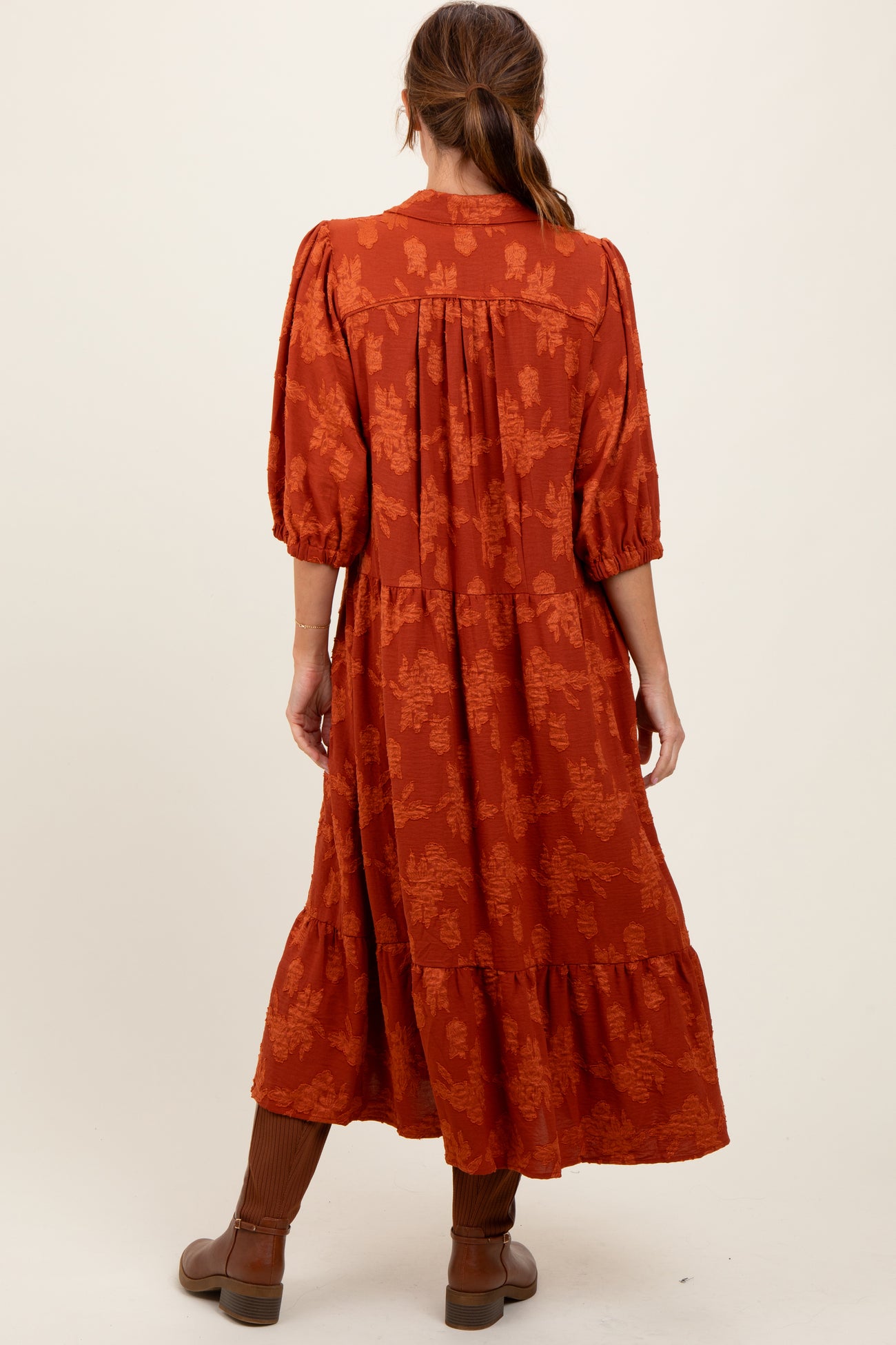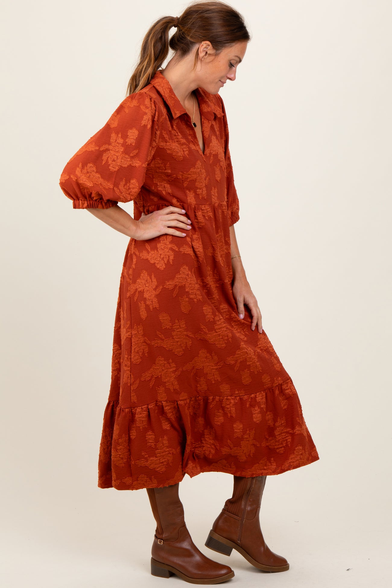 Step into effortless elegance with our Dark Orange Floral Applique Collared Midi Dress. This stunning dress features intricate floral applique detailing that adds texture and depth, making it perfect for both casual outings and special occasions. Designed with a classic collared neckline and half puff sleeves, it offers a relaxed yet refined silhouette. The midi length with a subtle ruffle hem creates a flattering flow that pairs beautifully with boots or heels. Crafted from lightweight, breathable fabric, this dress promises comfort without sacrificing style. Elevate your wardrobe with this versatile, timeless piece today!