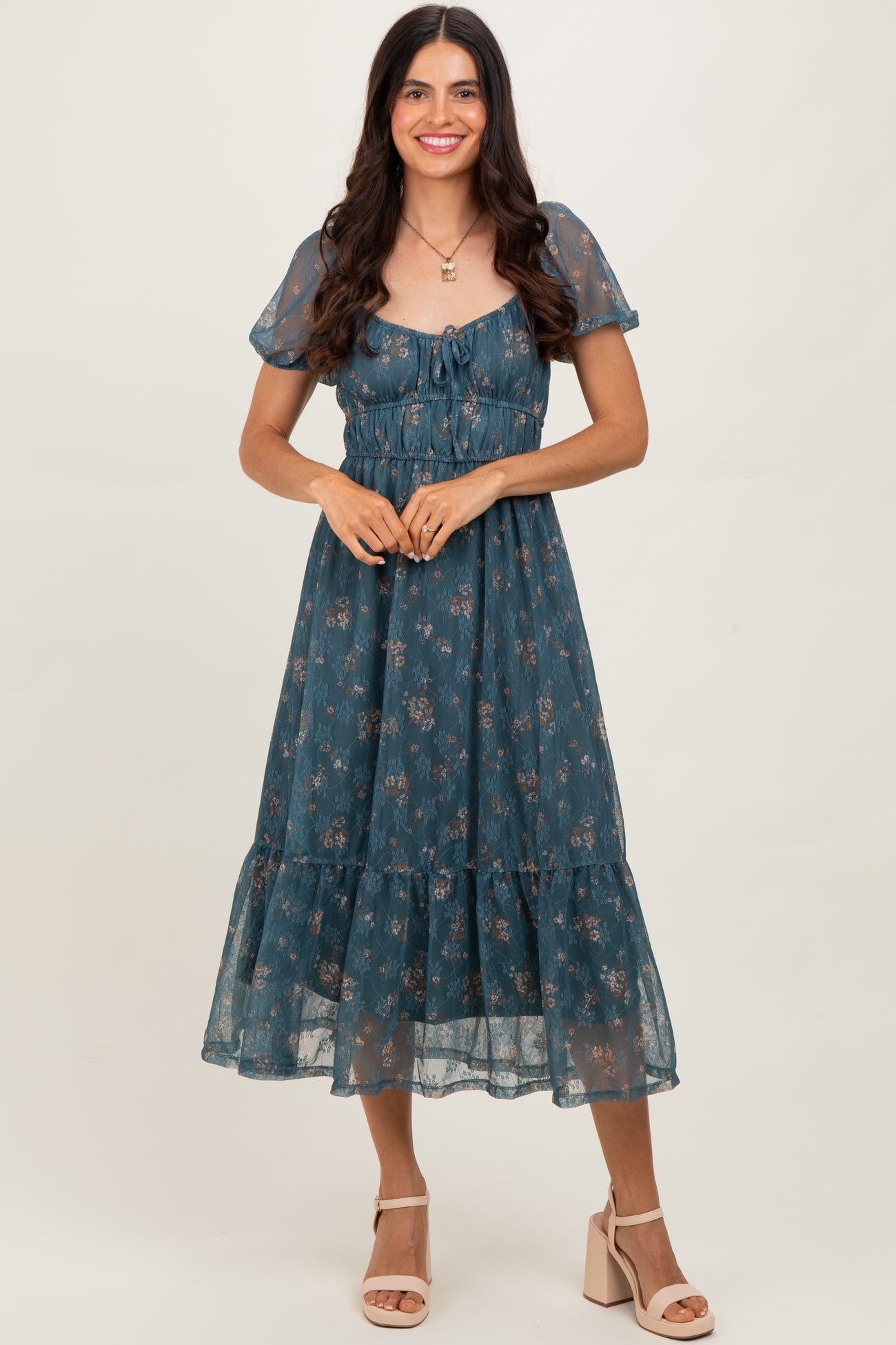 Deep Teal Floral Lace Overlay Puff Sleeve Midi Dress