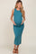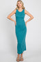 A basic fitted dress with side ruching, rounded neckline, and side slit.