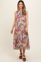 A lightweight printed maternity midi dress with a ruffle mock neck and tie detail v-neckline.