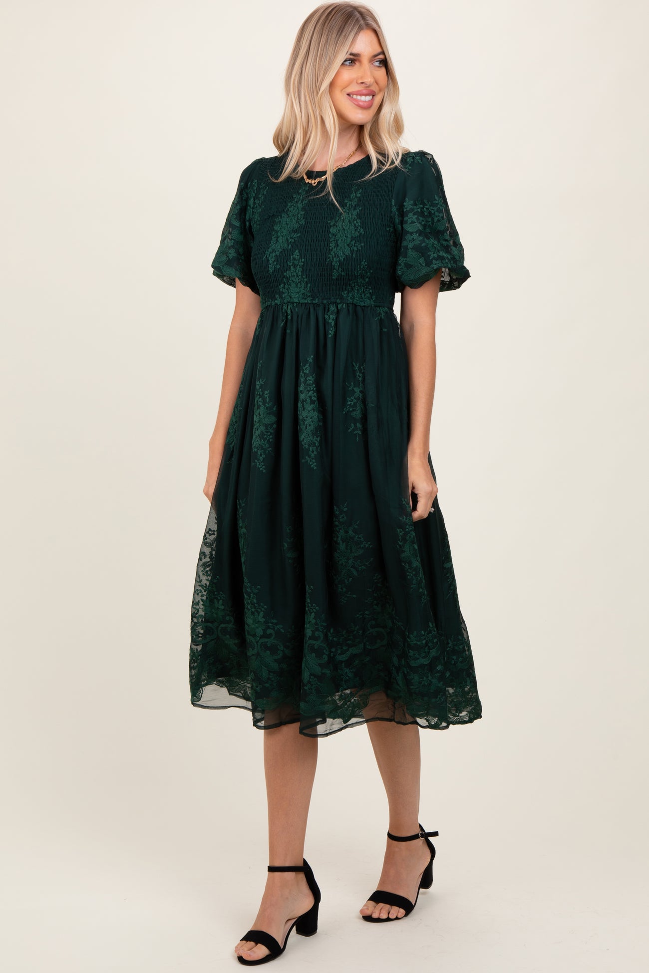 Forest Green Floral Lace Smocked Maternity Midi Dress