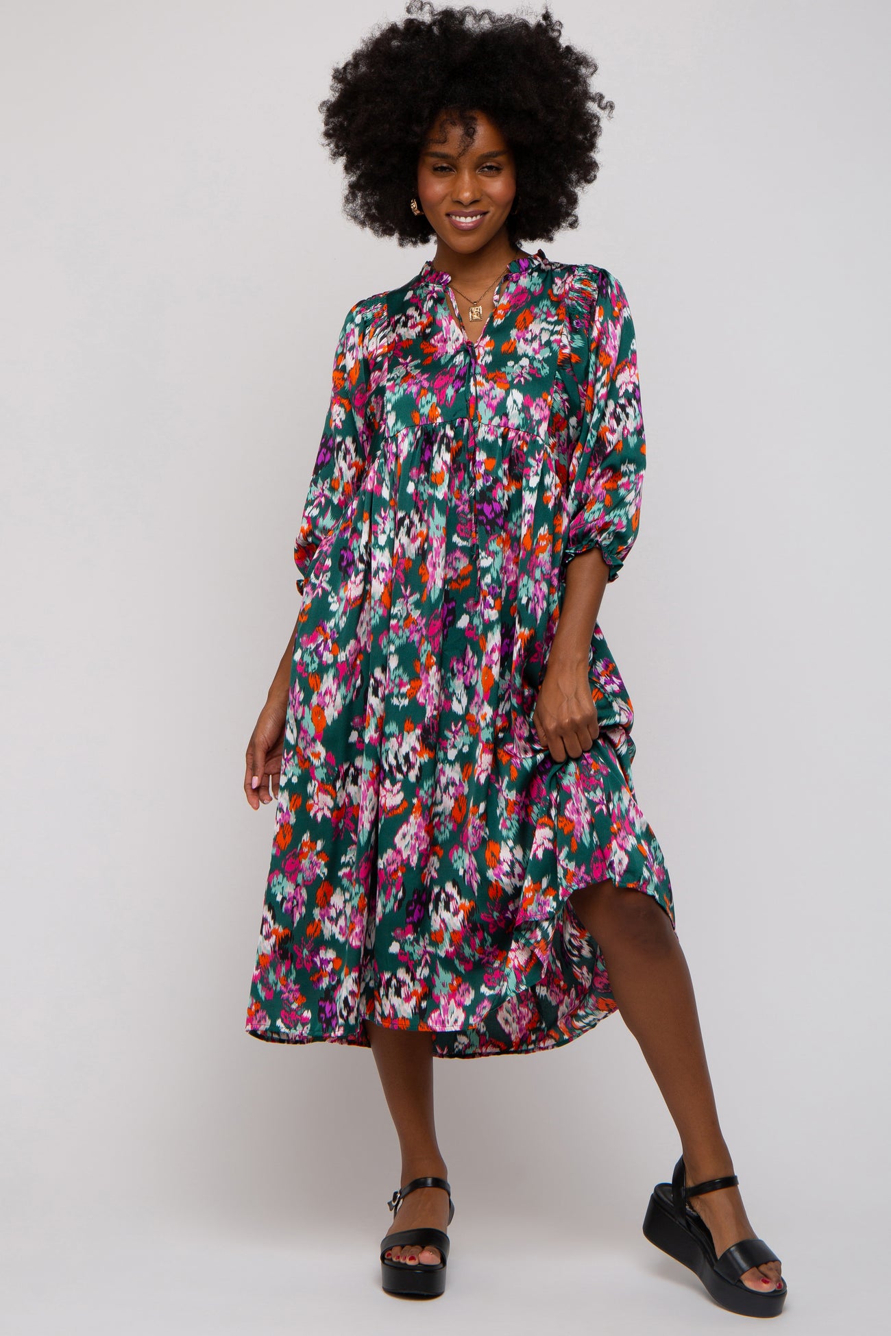 A floral print satin maternity midi dress featuring a ruffle neckline with a keyhole and an adjustable tie, an empire waist, 3/4 length sleeves and side pockets.