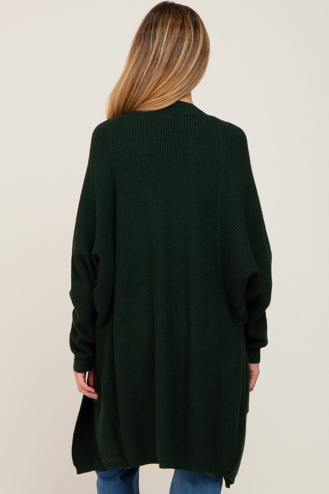 A solid knit maternity cardigan featuring front pockets, long sleeves and an open front.