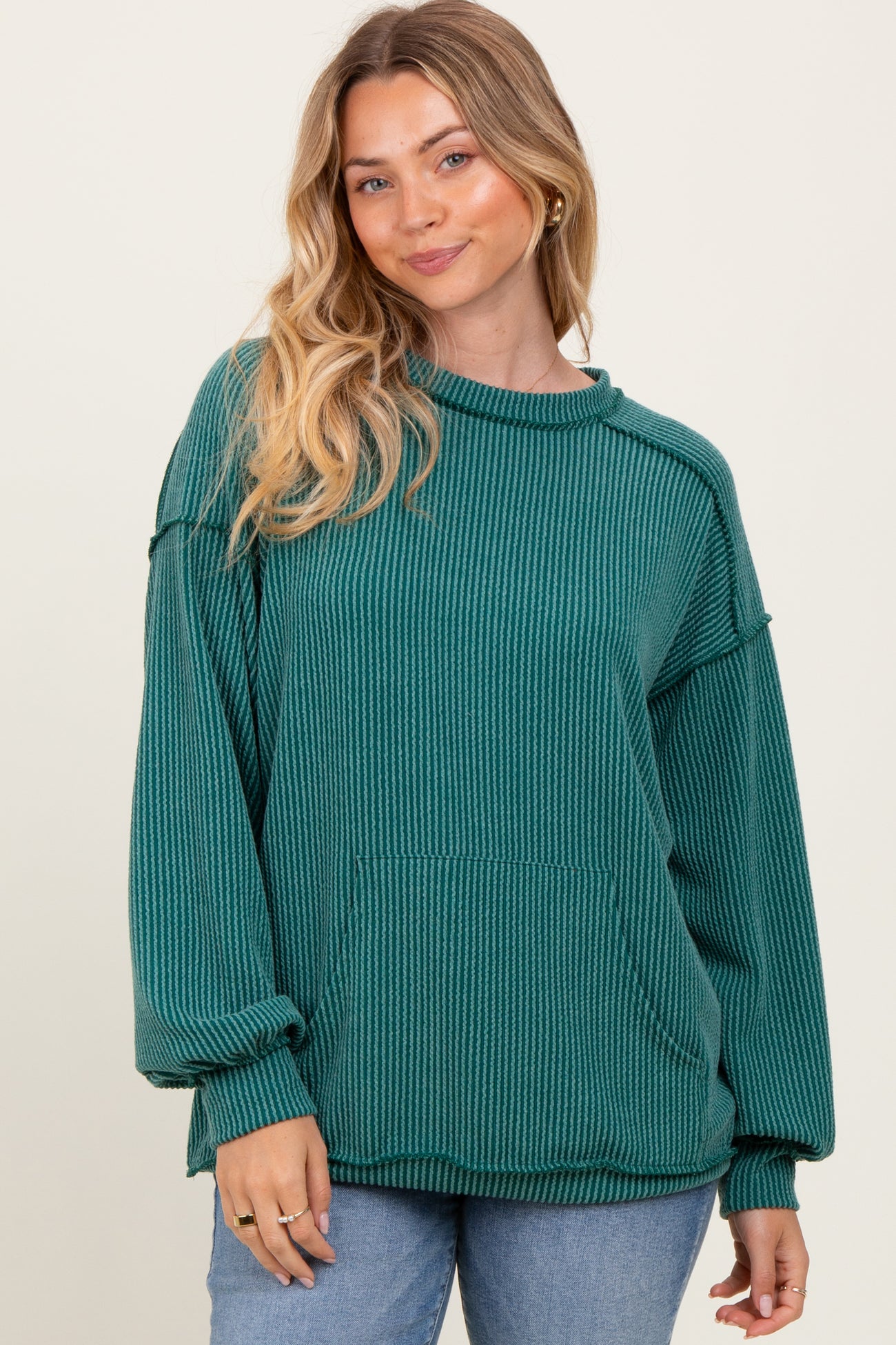 Forest Green Ribbed Knit Front Pocket Pullover