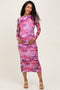 Fuchsia Floral Mesh Overlay Ruched Midi Dress