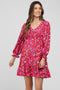 A floral print dress featuring a v-neckline, long sleeves with a ruffle cuff, a smocked elastic front and a ruffle hem.