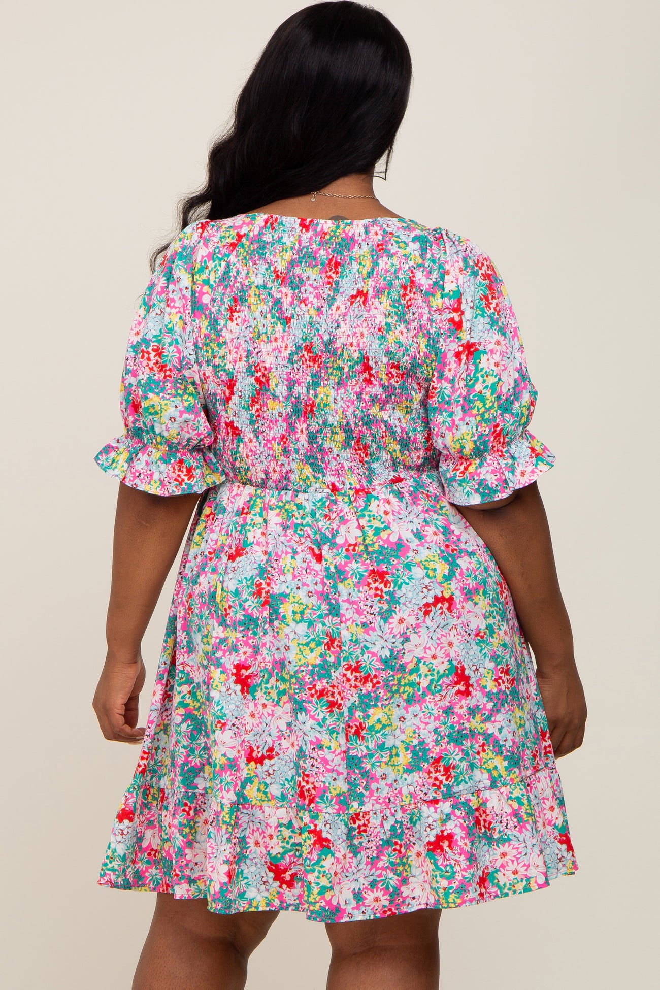 Fuchsia Floral Smocked Ruffle Accent Plus Dress