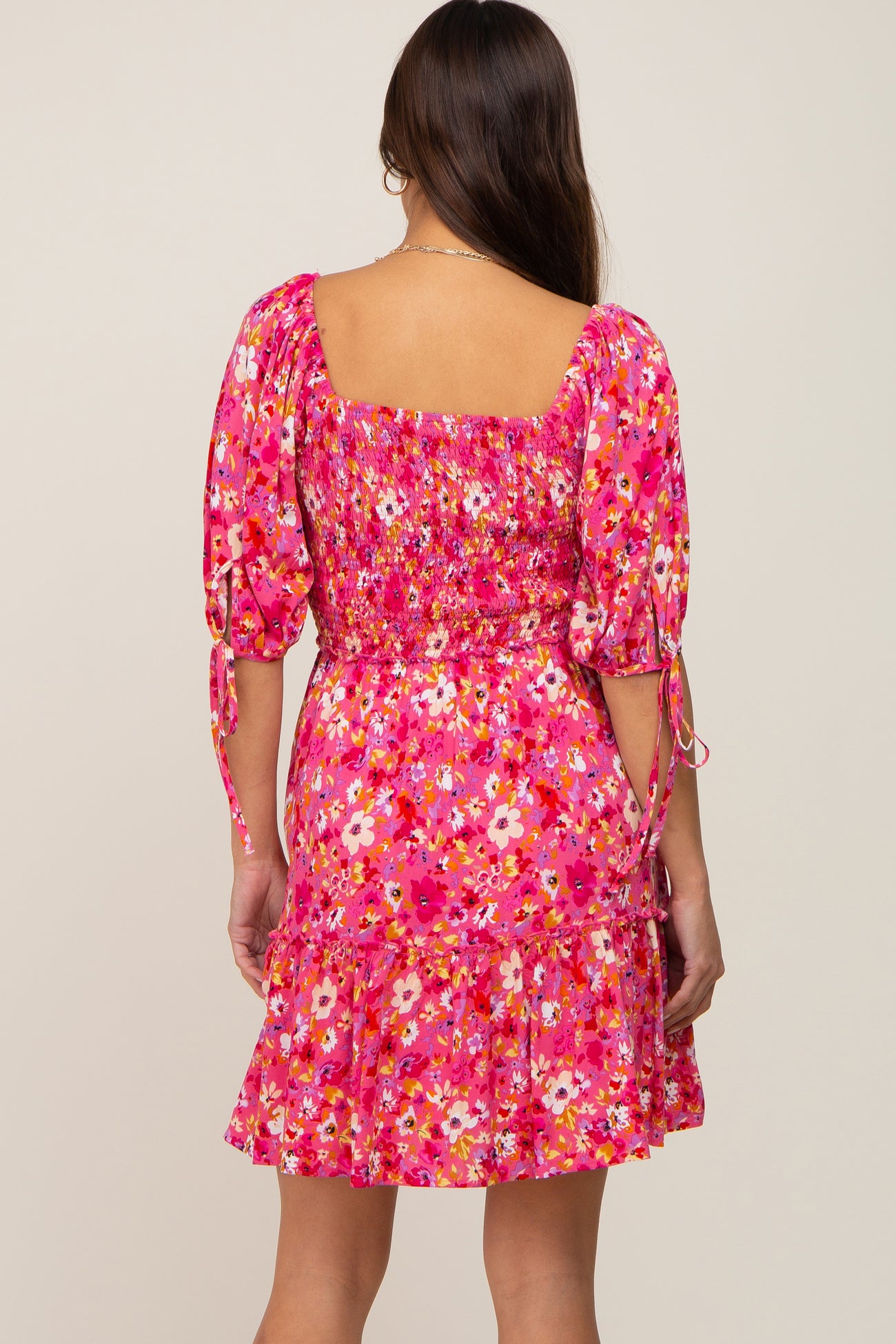 Fuchsia Floral Smocked Square Neck Ruffle Maternity Dress