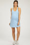 A printed dress with a split v-neckline, front button accents, short puff sleeves, a gathered bottom tier with piping accent.