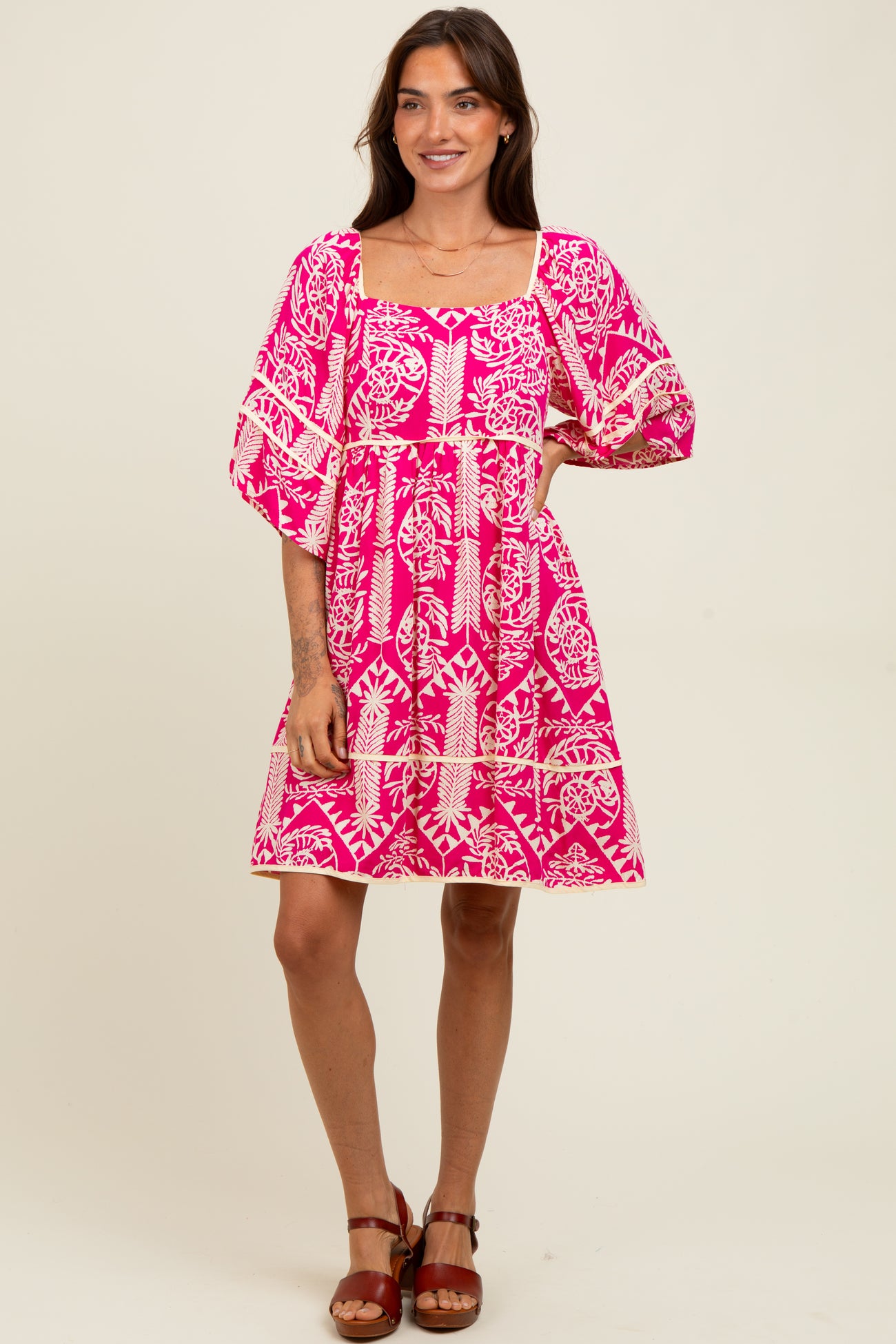 Fuchsia Printed Tie Back Contrast Trim Dress