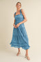 A solid sleeveless maternity maxi dress featuring flutter shoulder straps, a tiered body and a v-neckline.