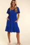 A solid midi dress with a smocked bust, flutter sleeves and ruffle hem. Pocketed.