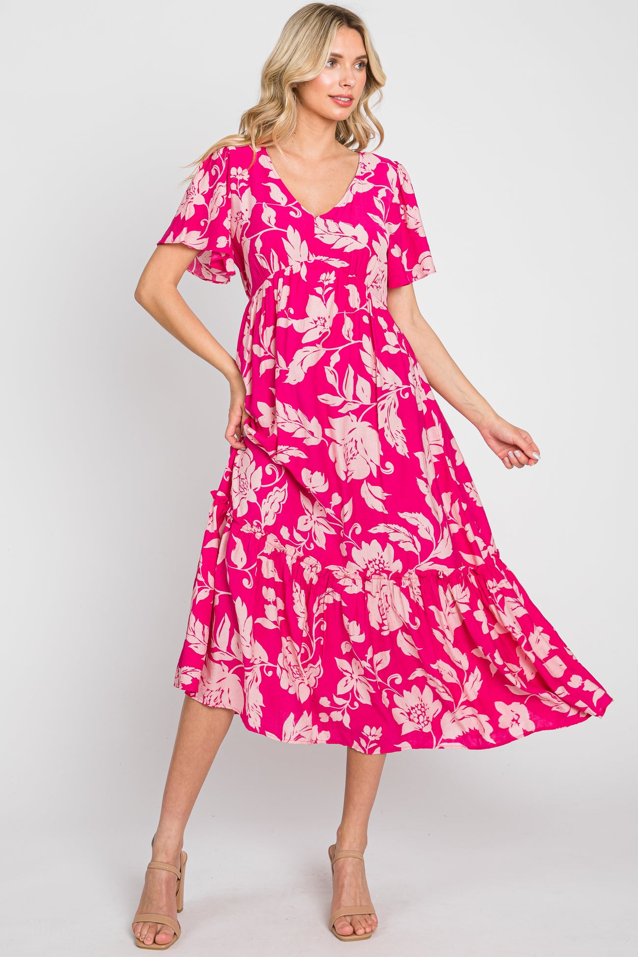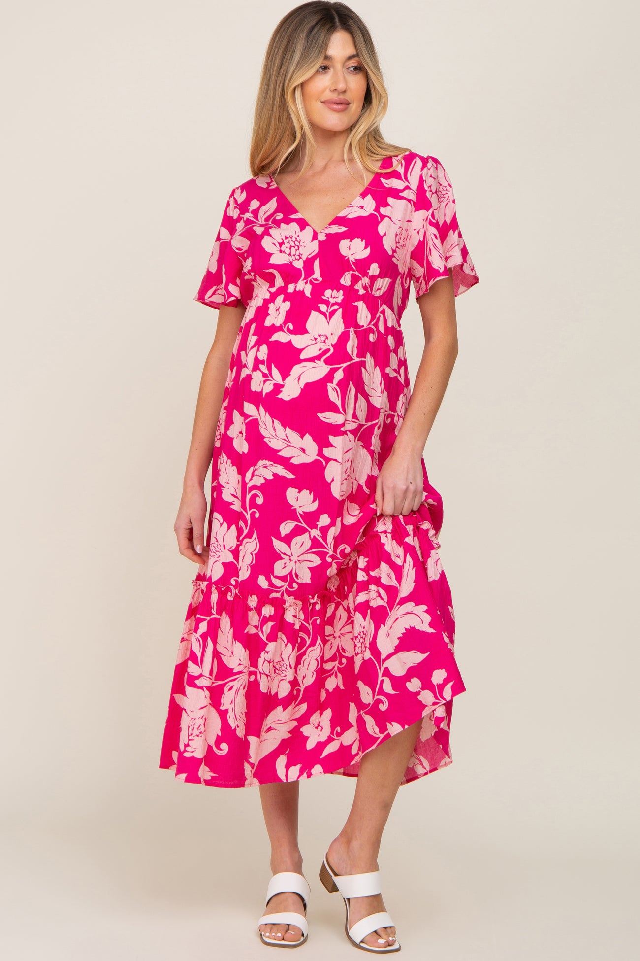 Fuchsia Tropical Print Ruffle Maternity Midi Dress