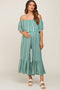 A printed midi dress with a tiered ruffle skirt, v-neckline, and flowy sleeves.