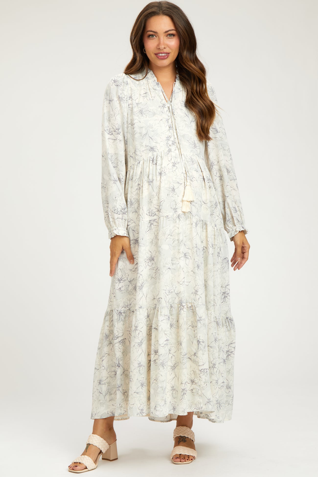 Gray Floral Tassel Tiered Long Sleeve Maternity Maxi Dress