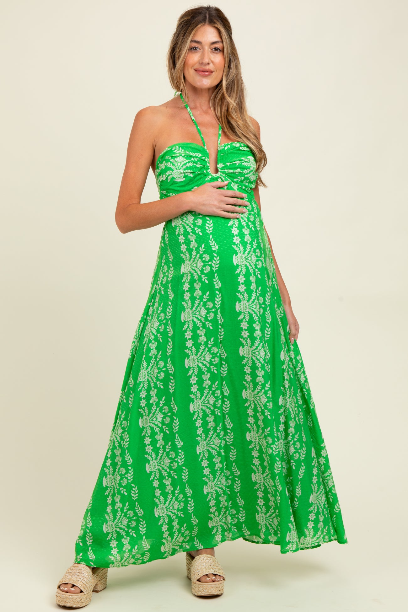Green Floral Halter Tie Back Cutout Maternity Maxi Dress