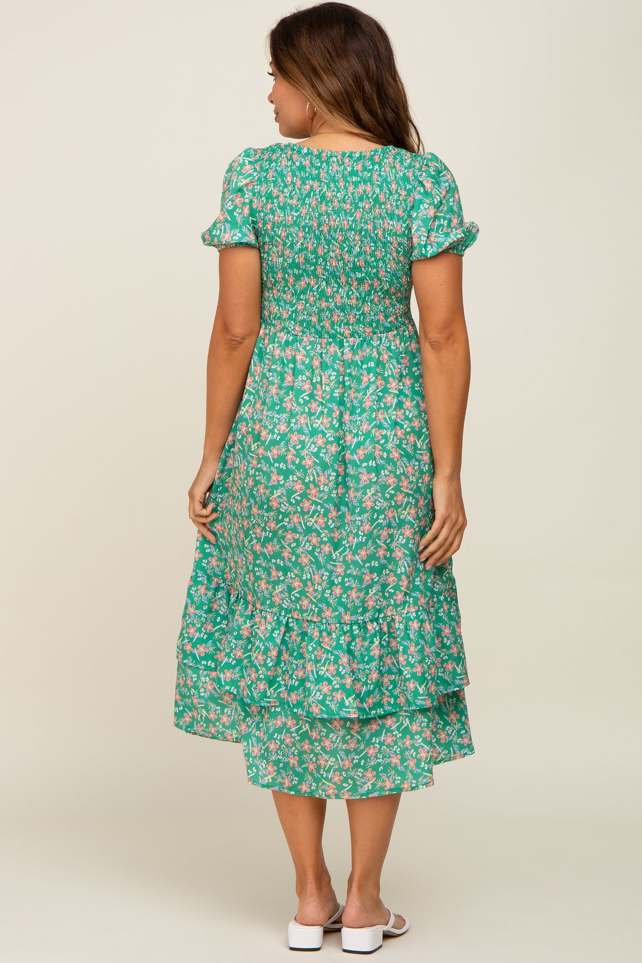 A floral maternity midi dress featuring a rounded neckline, a smocked bodice, short puff sleeves, side pockets, and a layered bottom tier.