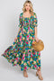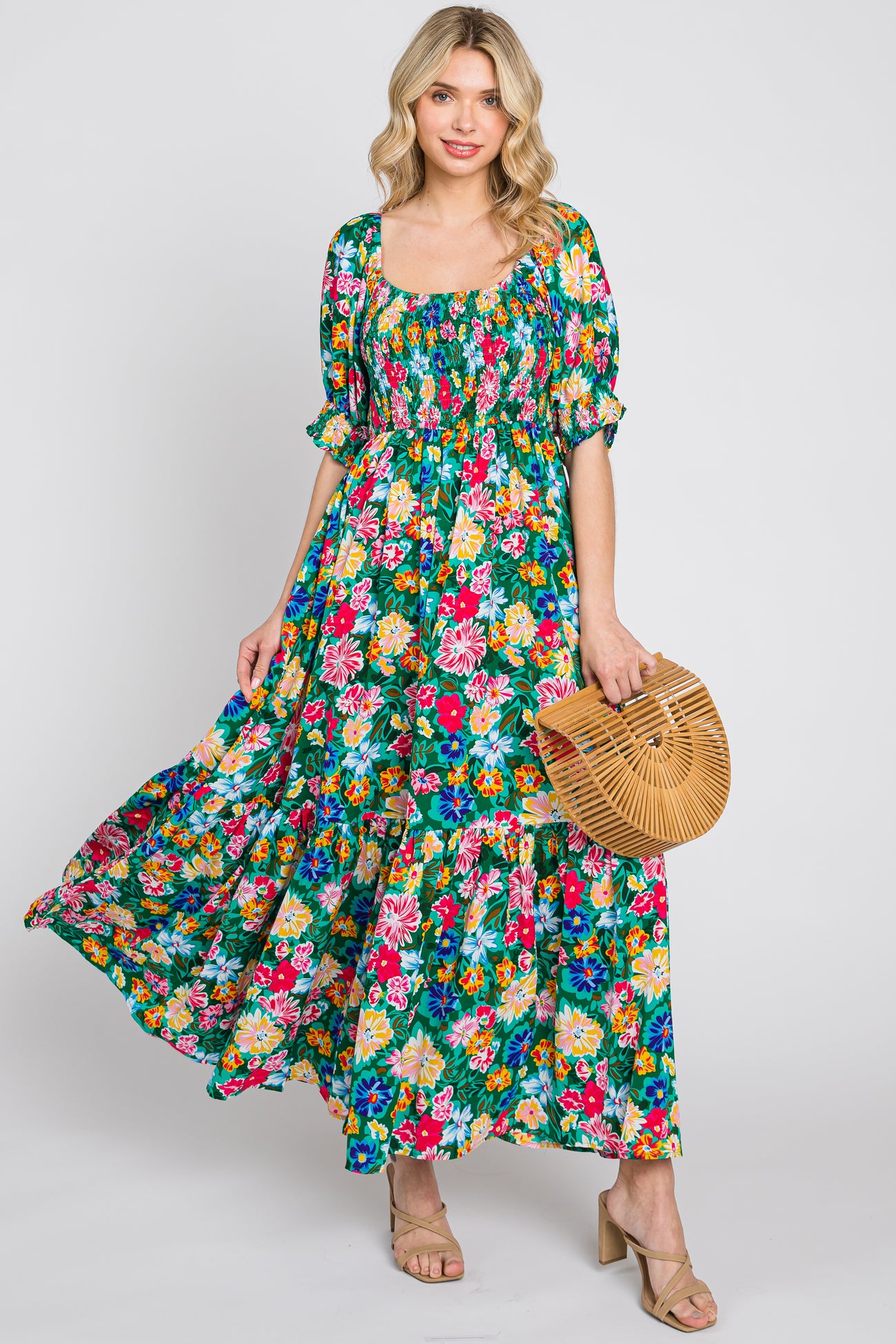 Green Floral Smocked Puff Sleeve Maternity Maxi Dress