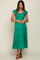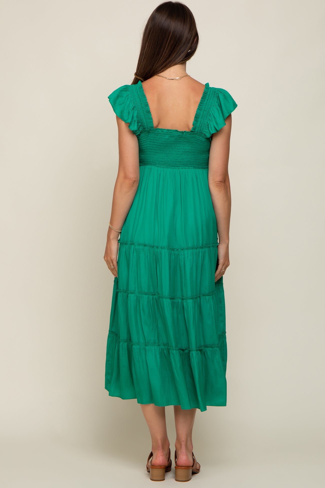 Green Satin Square Ruffle Neck Smocked Sleeveless Maternity Midi Dress