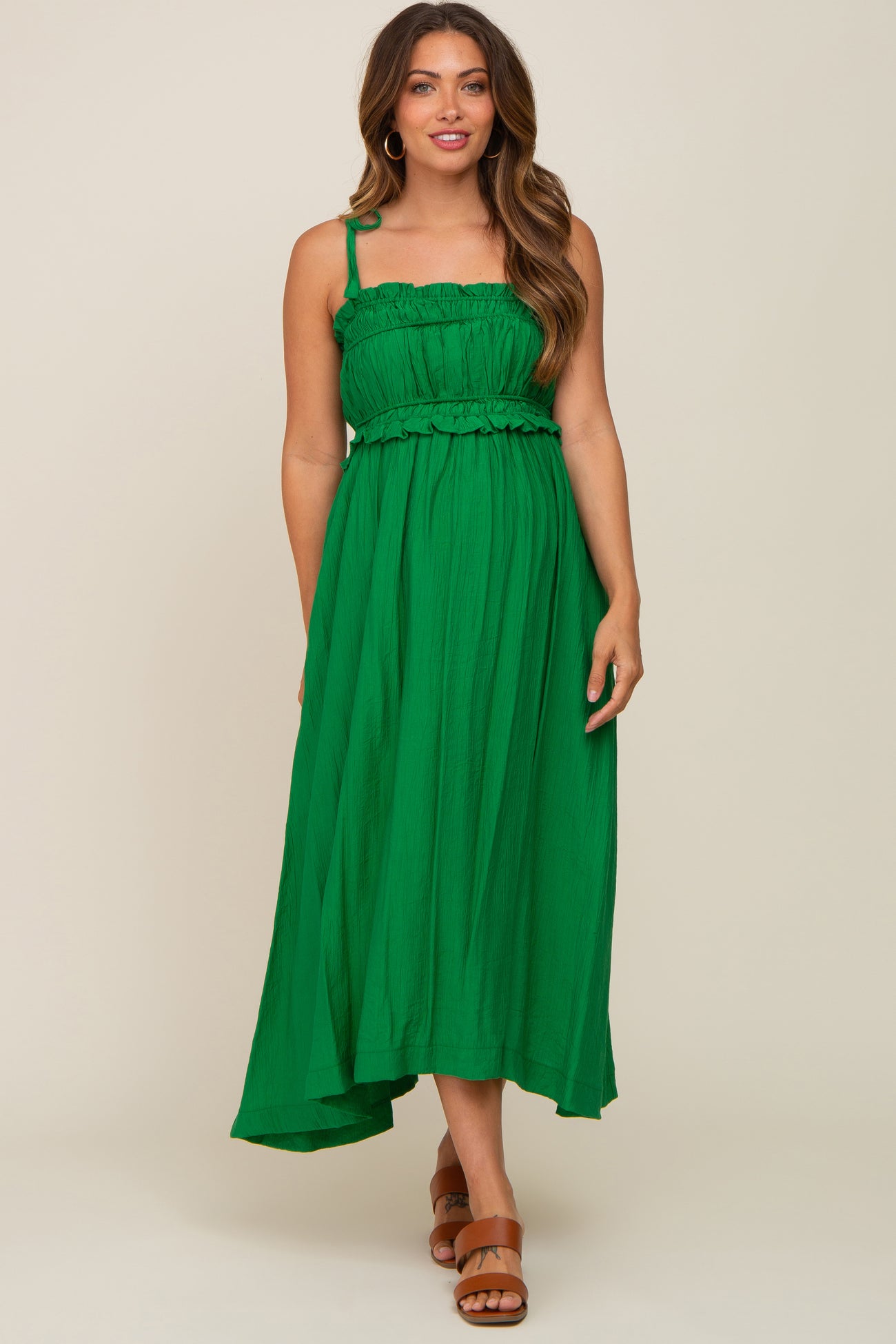 Green Shirred Shoulder Tie Maternity Midi Dress