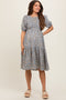 A solid maternity midi dress with a smocked bust, flutter sleeves and ruffle hem. Pocketed.