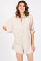 Details A textured romper featuring front buttons, short sleeves and a collared neckline. Content + Care
