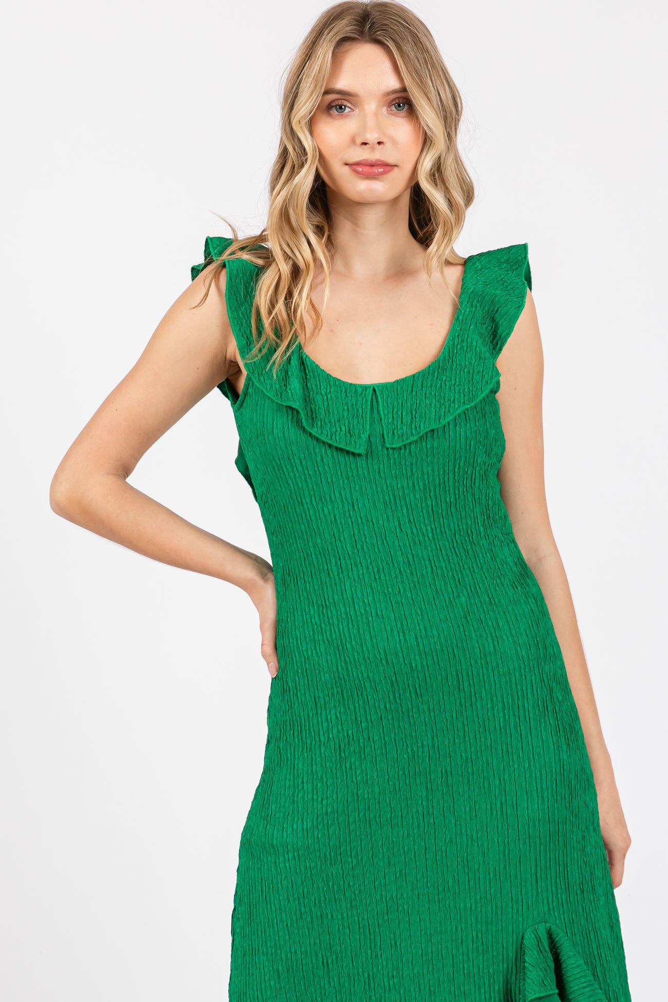 Green Textured Sleeveless Ruffle Slit Maxi Dress