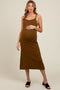A textured sleeveless maxi dress featuring ruffle shoulder straps, a scoop back, a front ruffle slit and a rounded neckline.