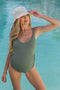 A ribbed maternity midi skirt with an elastic waistband, and a side slit.