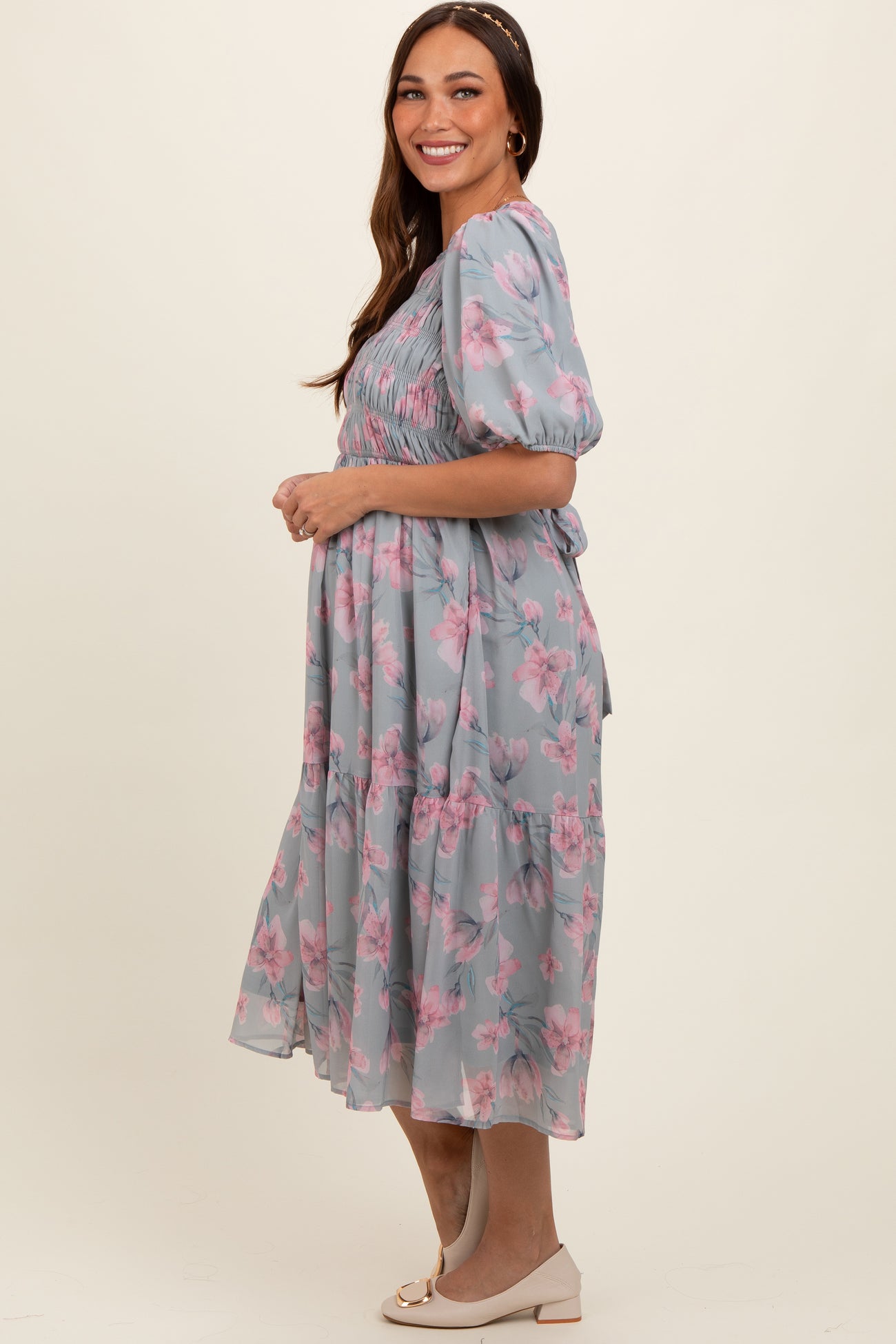 Grey Floral Smocked Ruffle Hem Maternity Midi Dress
