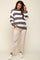 A fuzzy maternity sweater with a striped motif, a rounded neckline, and long drop shoulder sleeves.