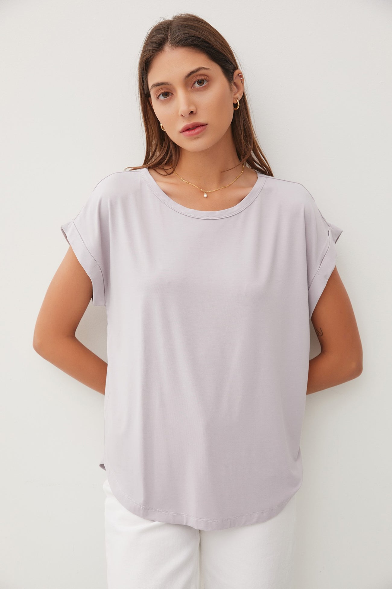 A solid short sleeve top with rolled cuff short sleeves and rounded hem.