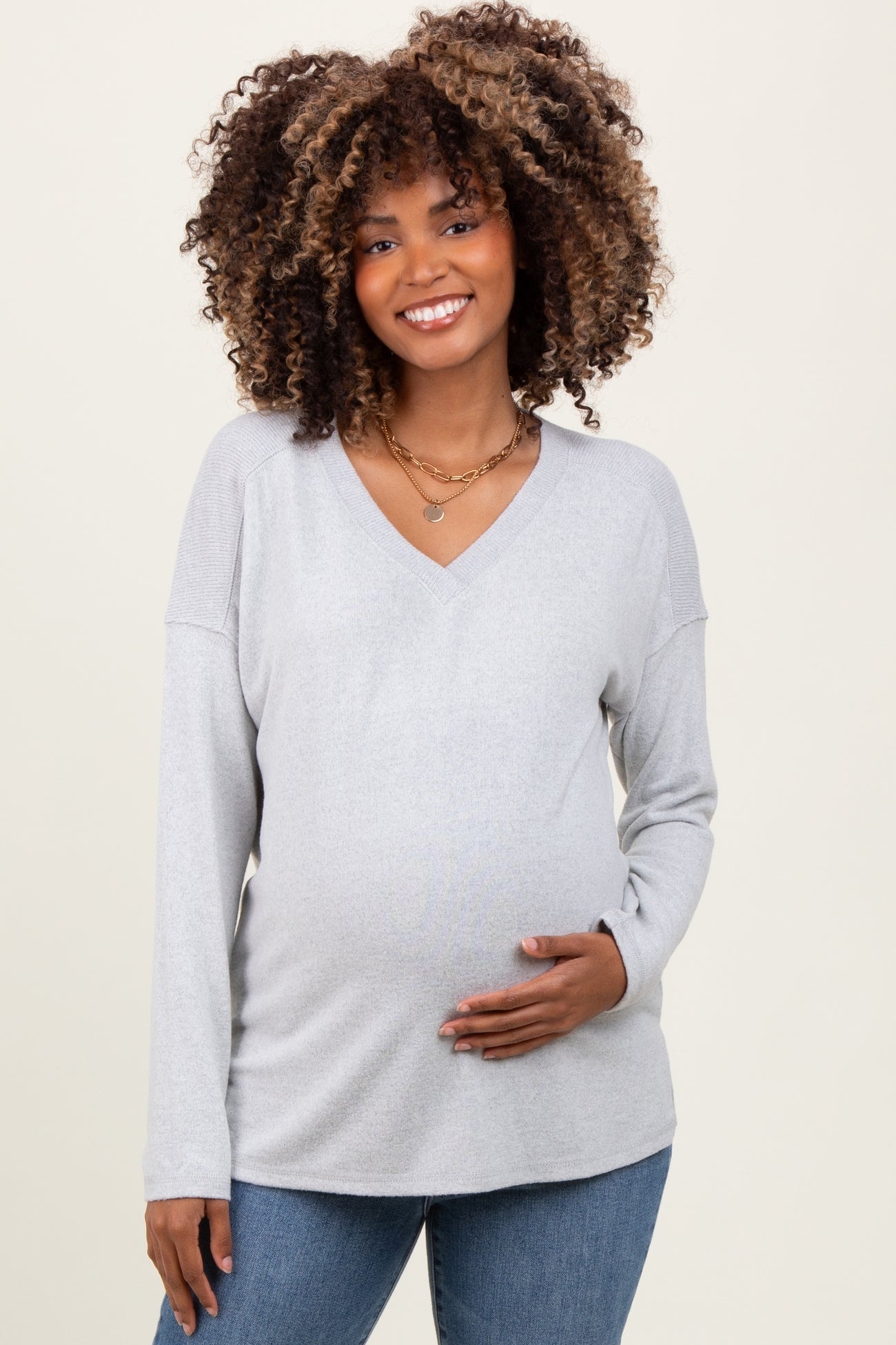 Heather Grey Basic V-Neck Long Sleeve Brushed Knit Maternity Top