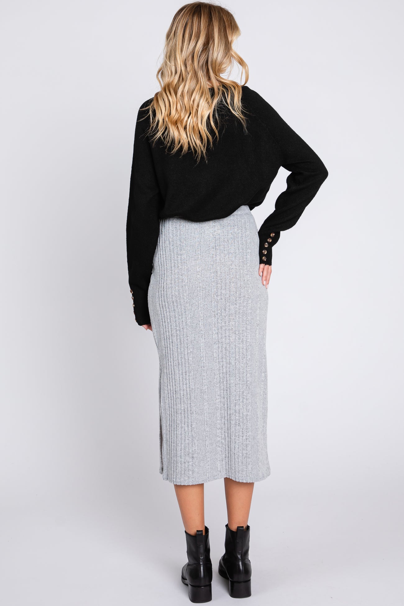 Heather Grey Soft Knit Ribbed Side Slit Midi Skirt