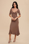 A solid ribbed dress featuring short sleeves, a self-tie back and a square neckline.