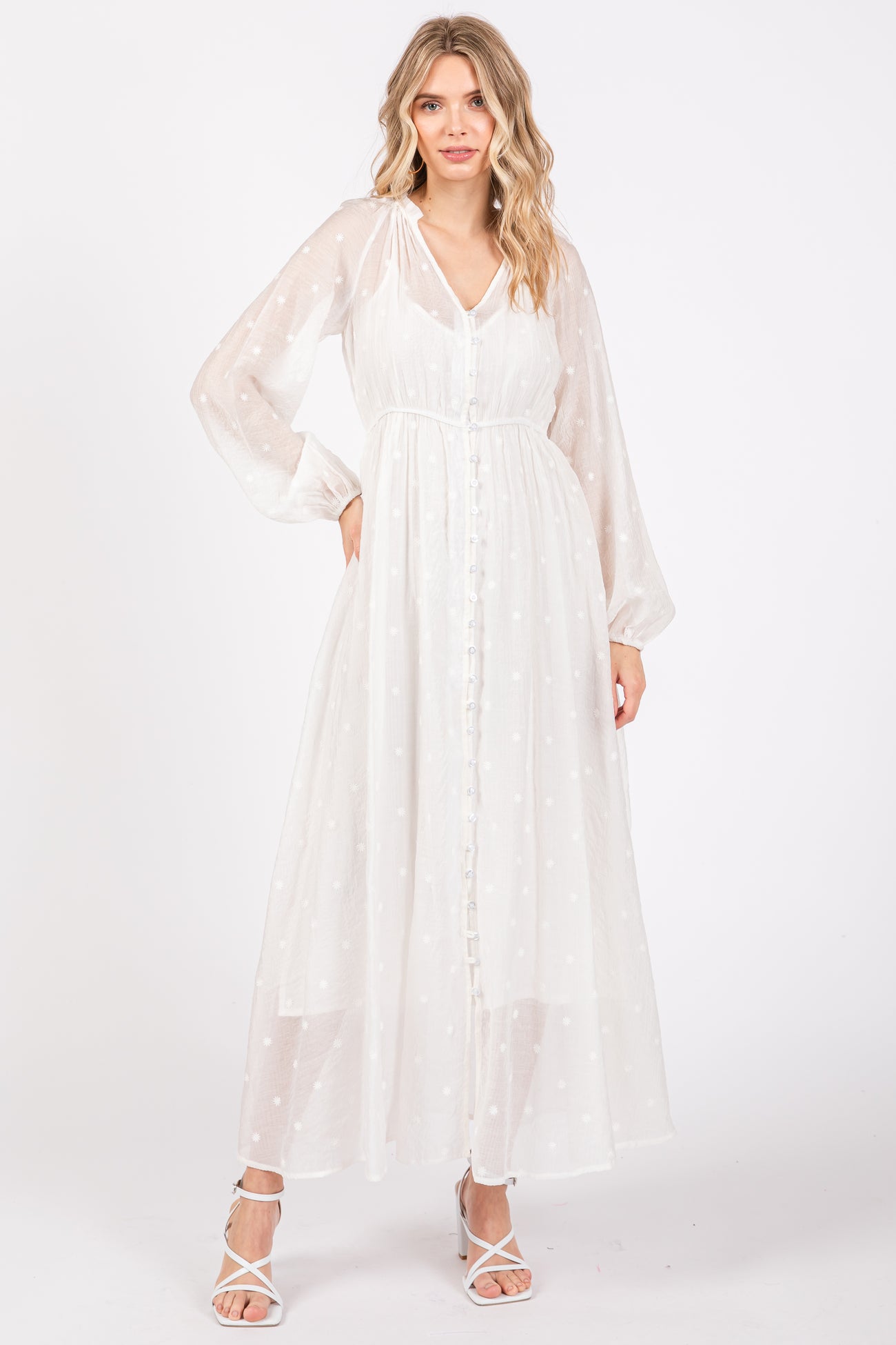 A solid floral embroidered maternity maxi dress in a long sleeve button down style. Dress is semi sheer with camisole dress underneath.